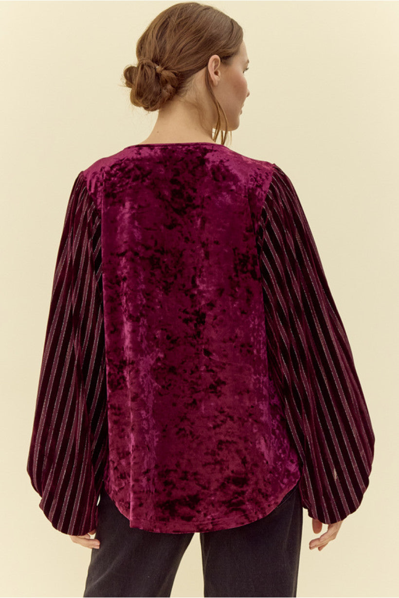 Velvet top with V-neck, long draped sleeves featuring striped texture.- Non-sheer, lightweight.