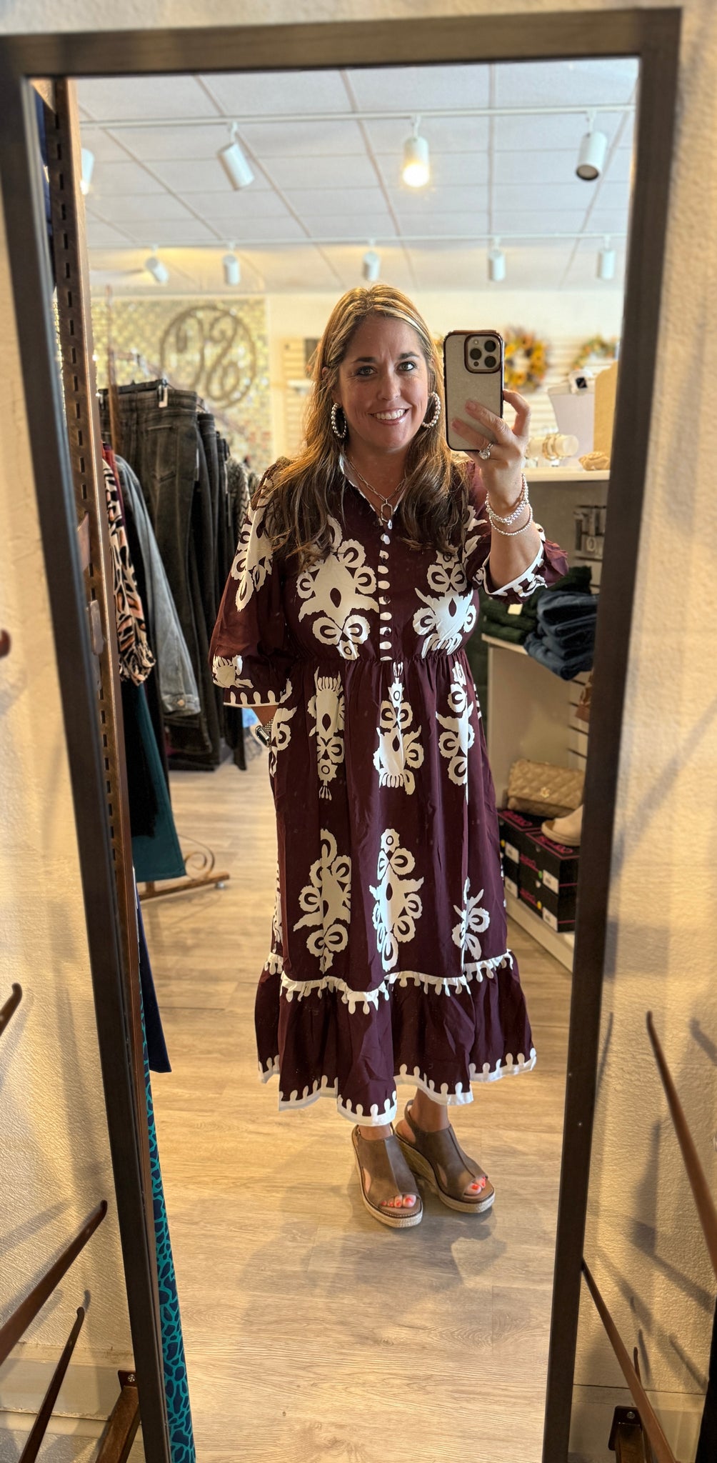GiGiO Bold Print Shirt Style Midi Dress with a 3/4 Length Sleeve-Burgundy TG1854