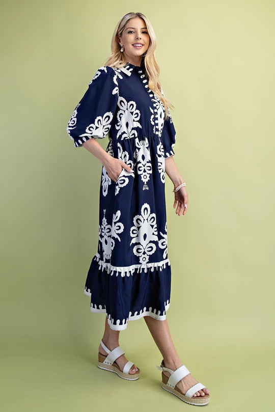 GiGiO Bold Print Shirt Style Midi Dress with a 3/4 Length Sleeve-Navy TG1854