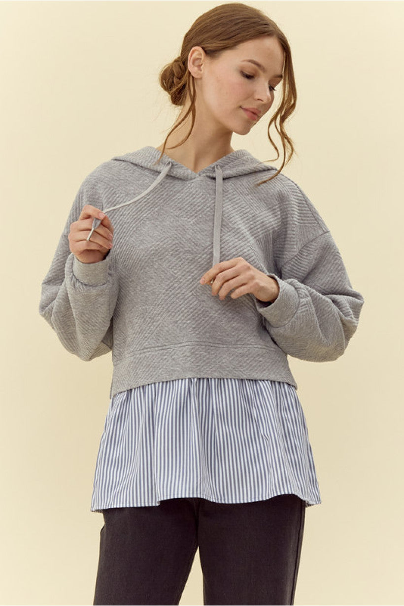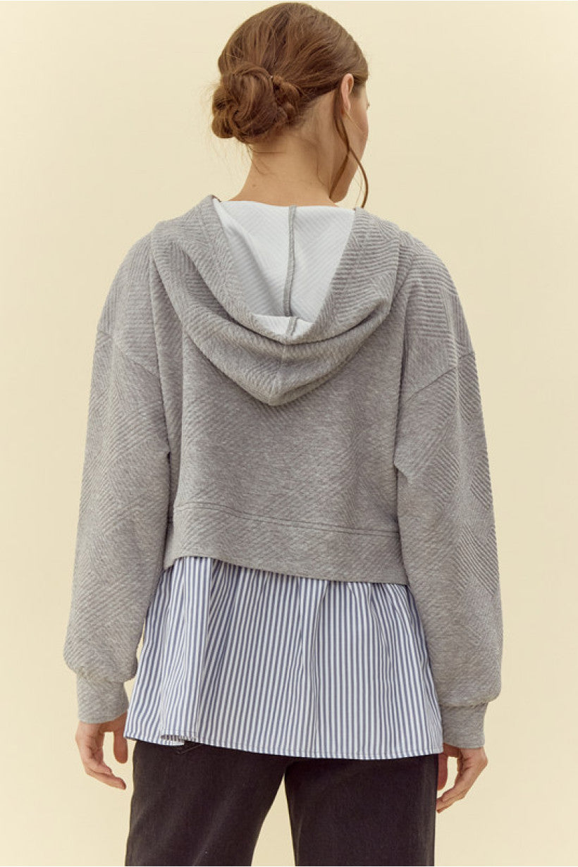Textured sweatshirts with drawstring hoodie, drop shoulders, long sleeves, and faux layer striped style.- Non-sheer, lightweight.