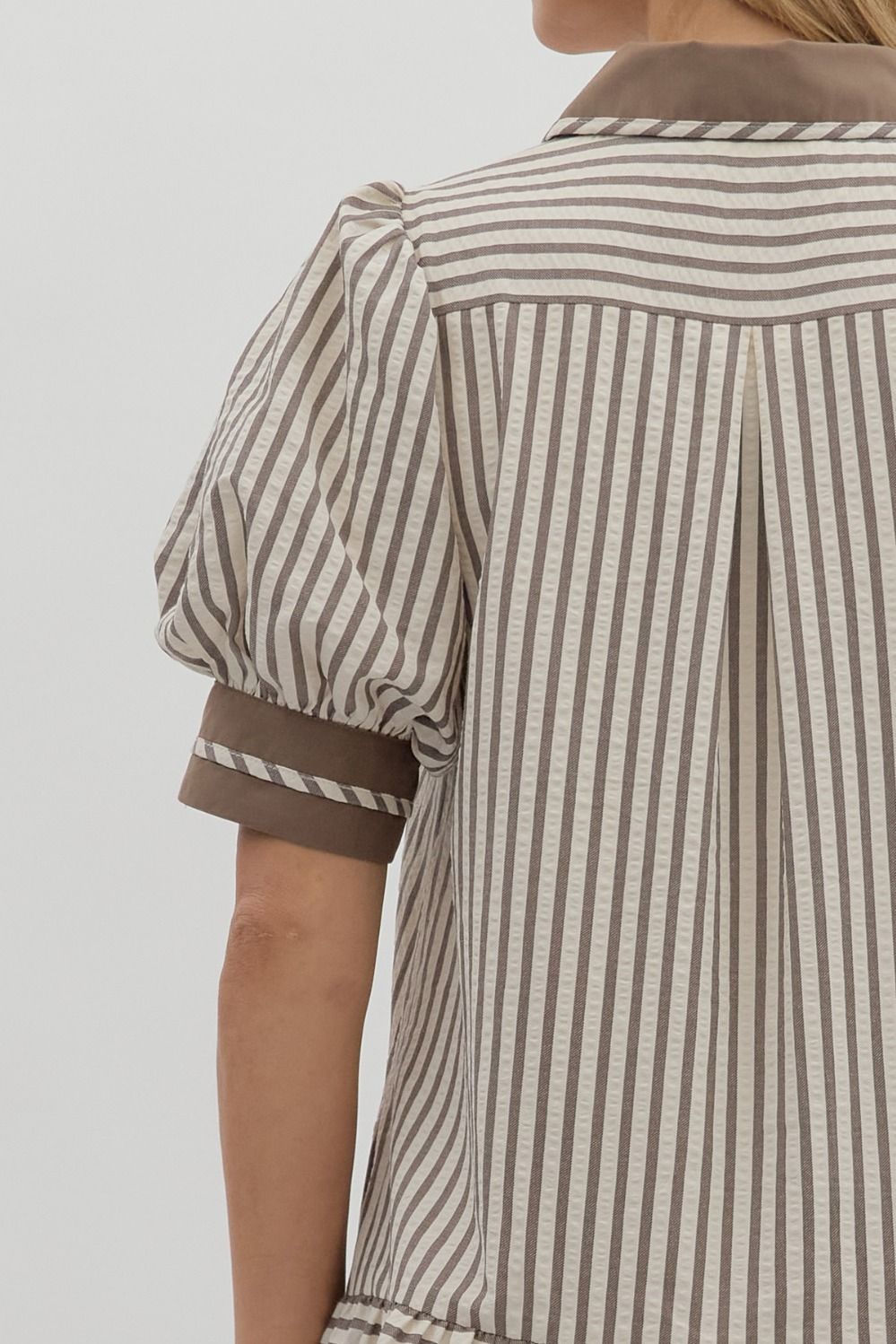 Textured stripe pattern short puff sleeve mini dress featuring stripe inset contrast collar spread collar. Side pockets. Lined. Woven.