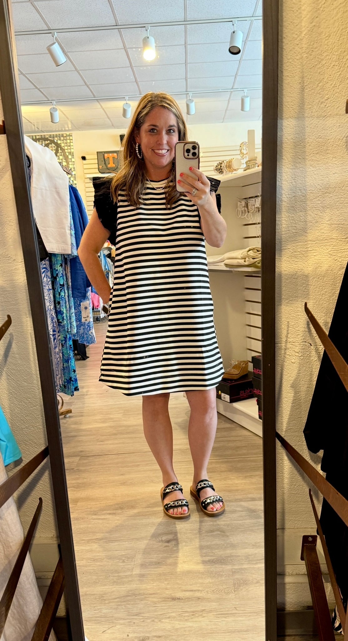 Striped print dress with U-neck, and ruffly trimming shoulder.- Non-sheer, medium weight.- Model is 5'7'' and is wearing a Small.