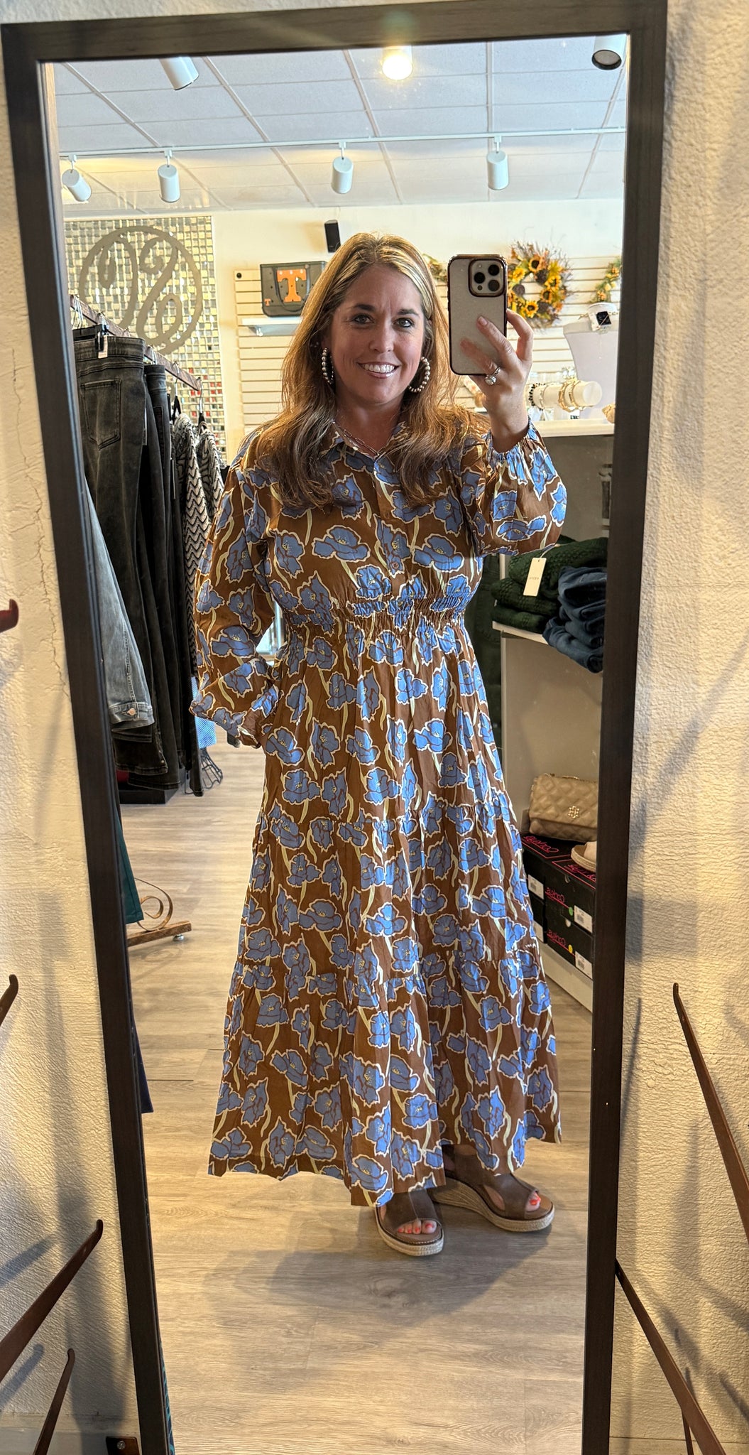 Long sleeves tiered floral midi dress, front button, collared neckline, smocked waist line.
